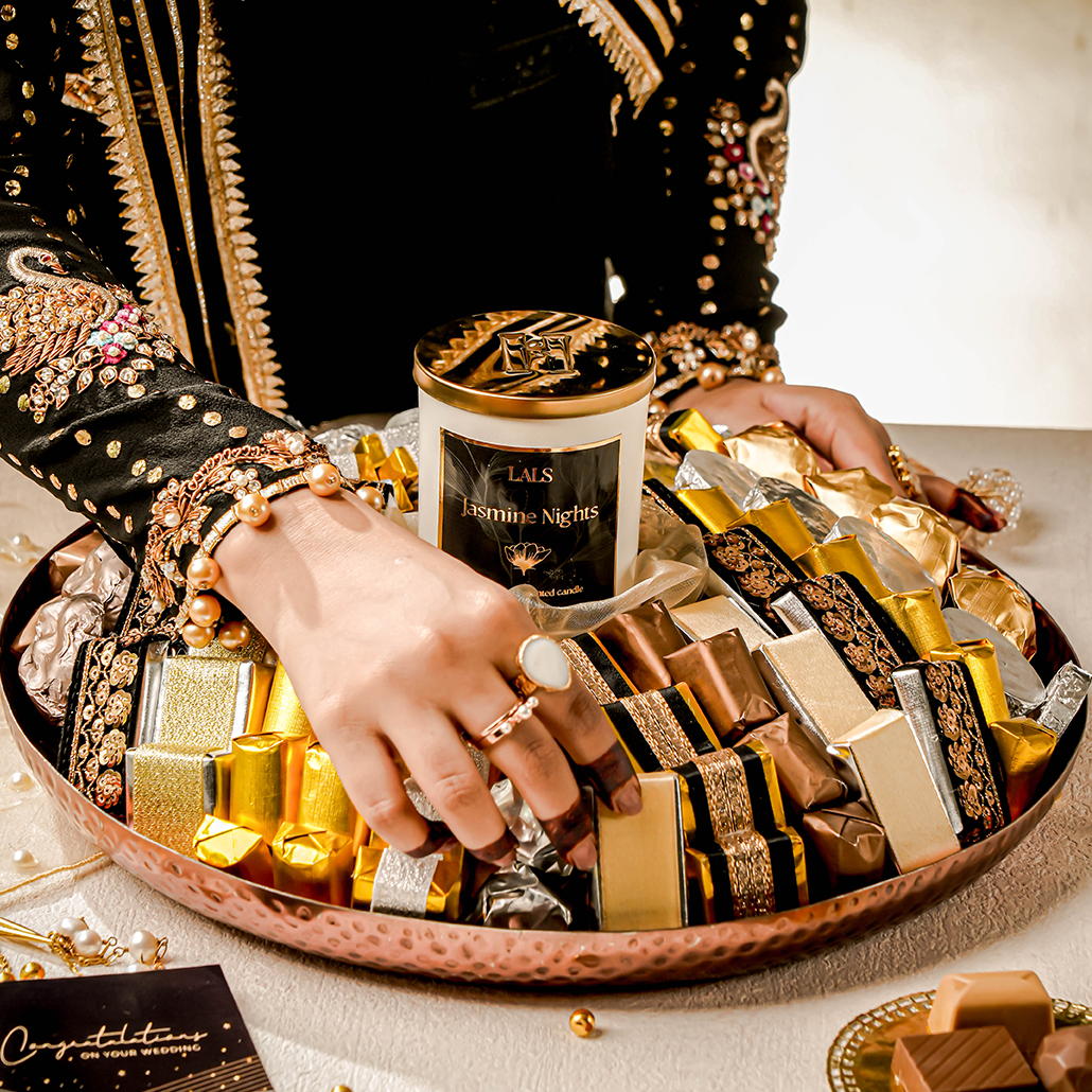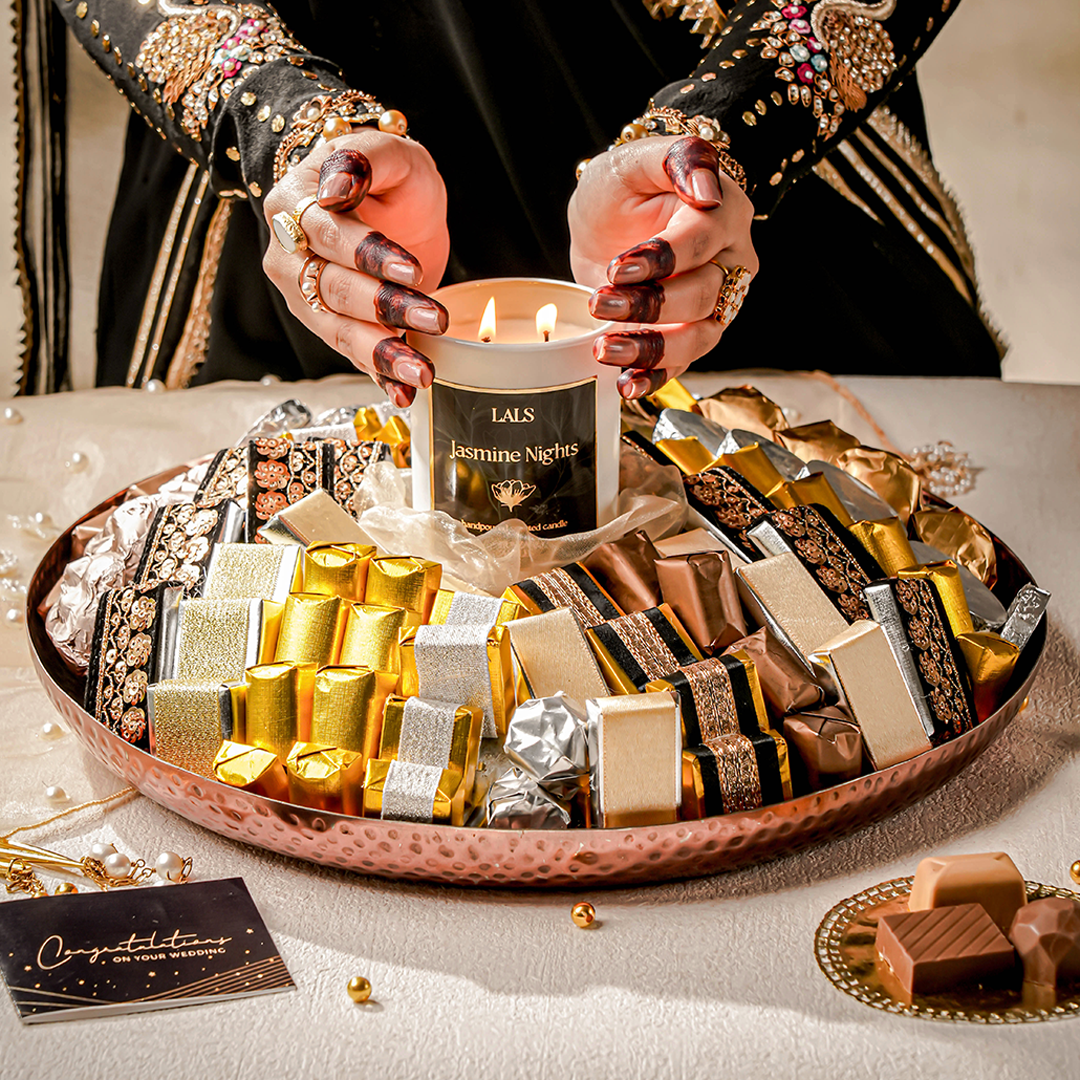 Celebrate love and new beginnings with our exquisite Copper Hammered Chocolate Platter, paired with a luxurious scented candle. Filled with decadent & hand crafted chocolates, this platter makes the perfect gift for your special day. Be sure to include a heartfelt message on the complimentary greeting card for added personalization.