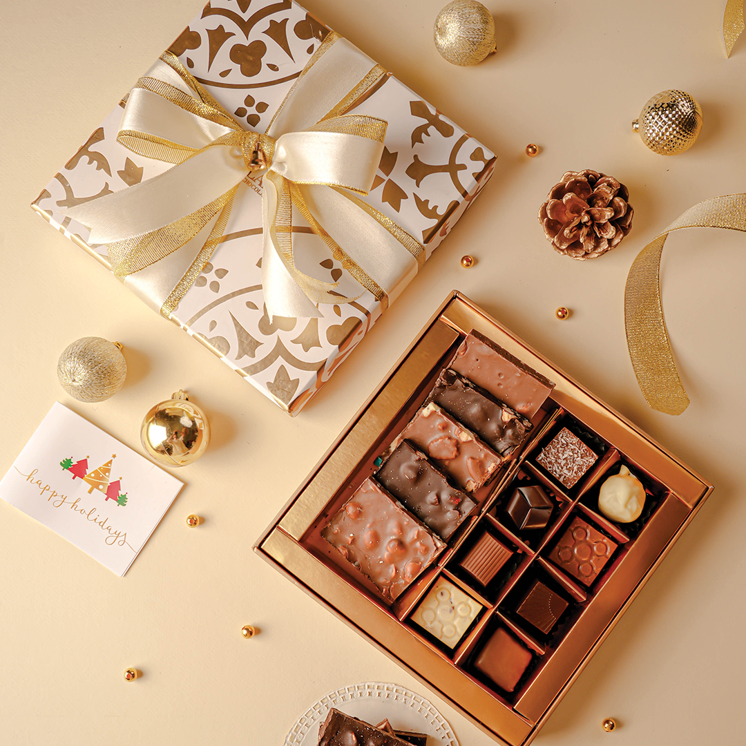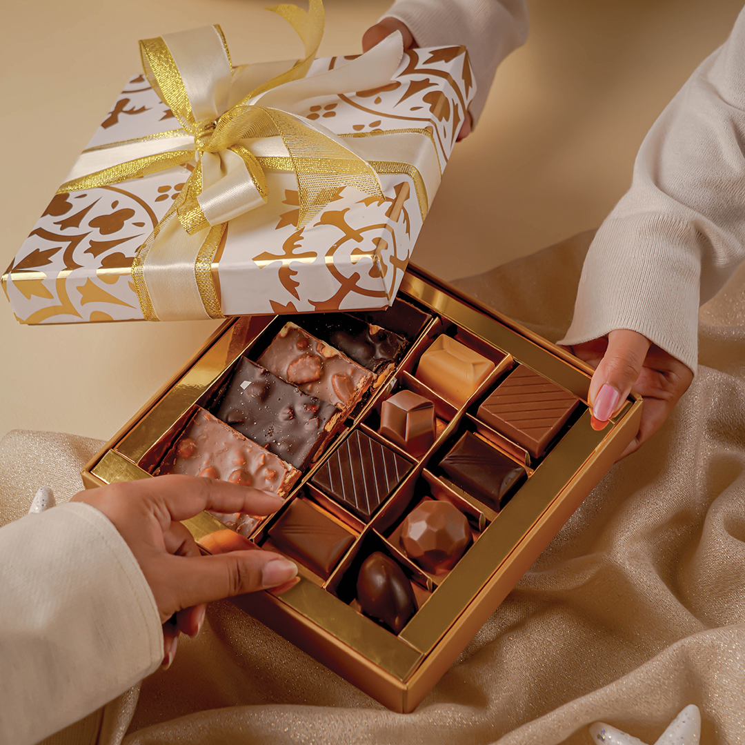 Filled with an assortment of decadent chocolate barks and handmade chocolate bon bons, this elegant box is adorned with a white satin and gold zari ribbon, finished with a delicate trinket bell. It’s a beautiful way to spread love and sweetness on any occasion. Add a heartfelt note on the complimentary greeting card to make your gift even more special.