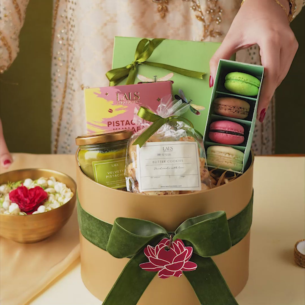 From the velvety richness of our Pistachio Spread to the indulgent Pistachio Kunafa Chocolate Bar (a viral favorite), every bite feels like a celebration. Add in the elegance of our Jade Dragonfly Box filled with artisanal chocolate bon bons, soft and chewy French macarons, and golden butter cookies, and you have a hamper designed to make sweet memories.