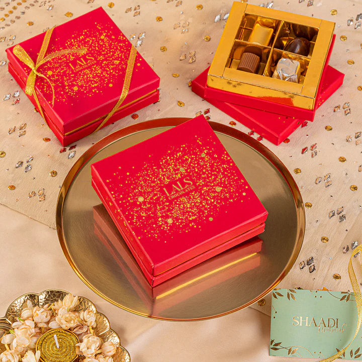 A gorgeous keepsake box adorned with bursts of gold confetti inspired by modern chic theme. It’s beautiful vibrant berry color makes it a perfect corporate giveaway for any occasion. Fill it with Classic Chocolates or Chocolate Bon Bons in all the festivities. Add complimentary greeting card on the checkout page with customized message to add a personalized touch.