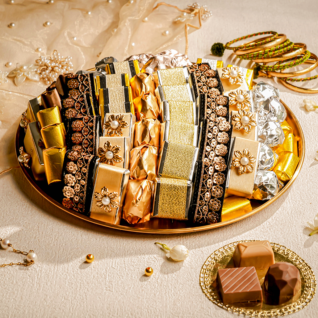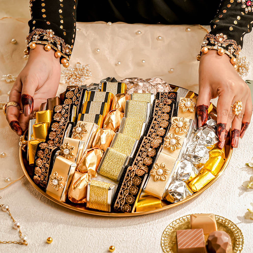 Presented on a beautiful platter, our Lals classic chocolates are a delightful addition to your celebrations, perfect for gifting and sharing with your cherished friends and family. Each platter is meticulously handcrafted with love, ensuring that every piece is a unique masterpiece. This exquisite platter includes 63 pieces of delicious chocolates, a delightful treat for your guests to savor. Please note that the platter's contents may vary slightly based on availability, adding an element of delightful surprise to your celebration. A special thanks to Sania Maskatiya for adding her designer dupatta as a prop for this shoot.