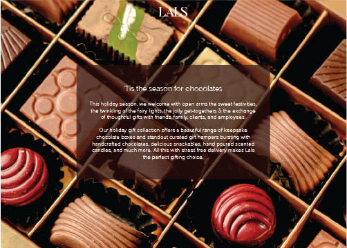 Lals has been the nation's leading chocolate & gifting brand since 2006. We have been serving Pakistan's top companies by managing their corporate gifting needs. As a nationwide renowned brand in the chocolate, gourmet date & gifting industry, Lals has elevated the concept of business gifting into an art.