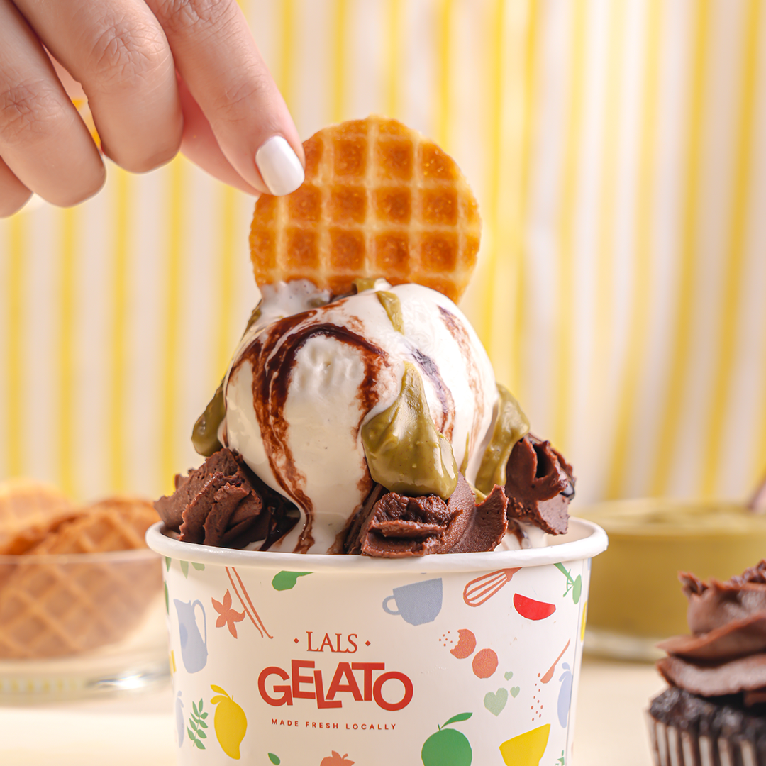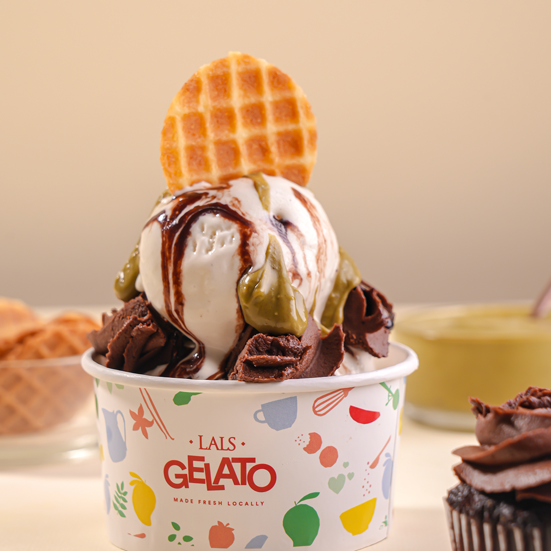 A rich chocolate cupcake base topped with scoops of creamy vanilla gelato, drizzles of gooey pistachio kunafa and chocolate sauce, and a waffle chip for that extra crunch. It’s messy, fun, and made for sweet tooths who want everything in one bite. Go on, dig in!