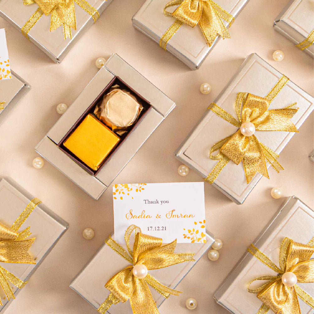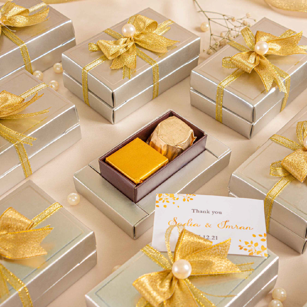 A gorgeous silver favor box tied with a ribbon & filled with handmade & fresh Lals chocolates – perfect for a wedding or corporate giveaways. Add a greeting card on the checkout page with a customized message for added personalization.